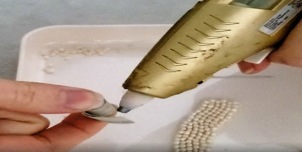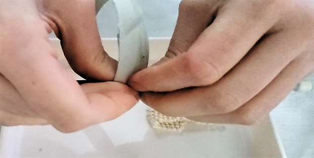Glue one end of the strip of beads to the paper roll base. Wrap around, adding 2 to 3 dots of glue along the way to attach the strip all the way around the roll, leaving a flap of extra “paper” at the end.